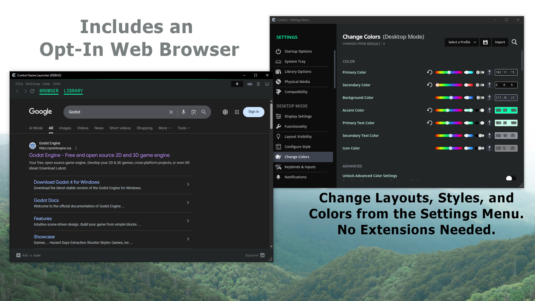 Control Game Launcher was created using the Godot Game Engine, meaning anything a video game can do, the Control Launcher can do and that’s a big deal.