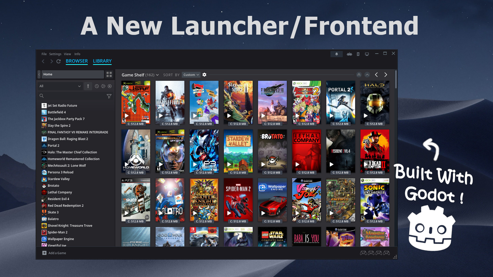Godot is very general purpose and adaptable compared to other game engines and has a large community of people that already know how to use it. So now the same people making the video games can be the same people expanding the Game Launcher through it's standardized plugin system.*